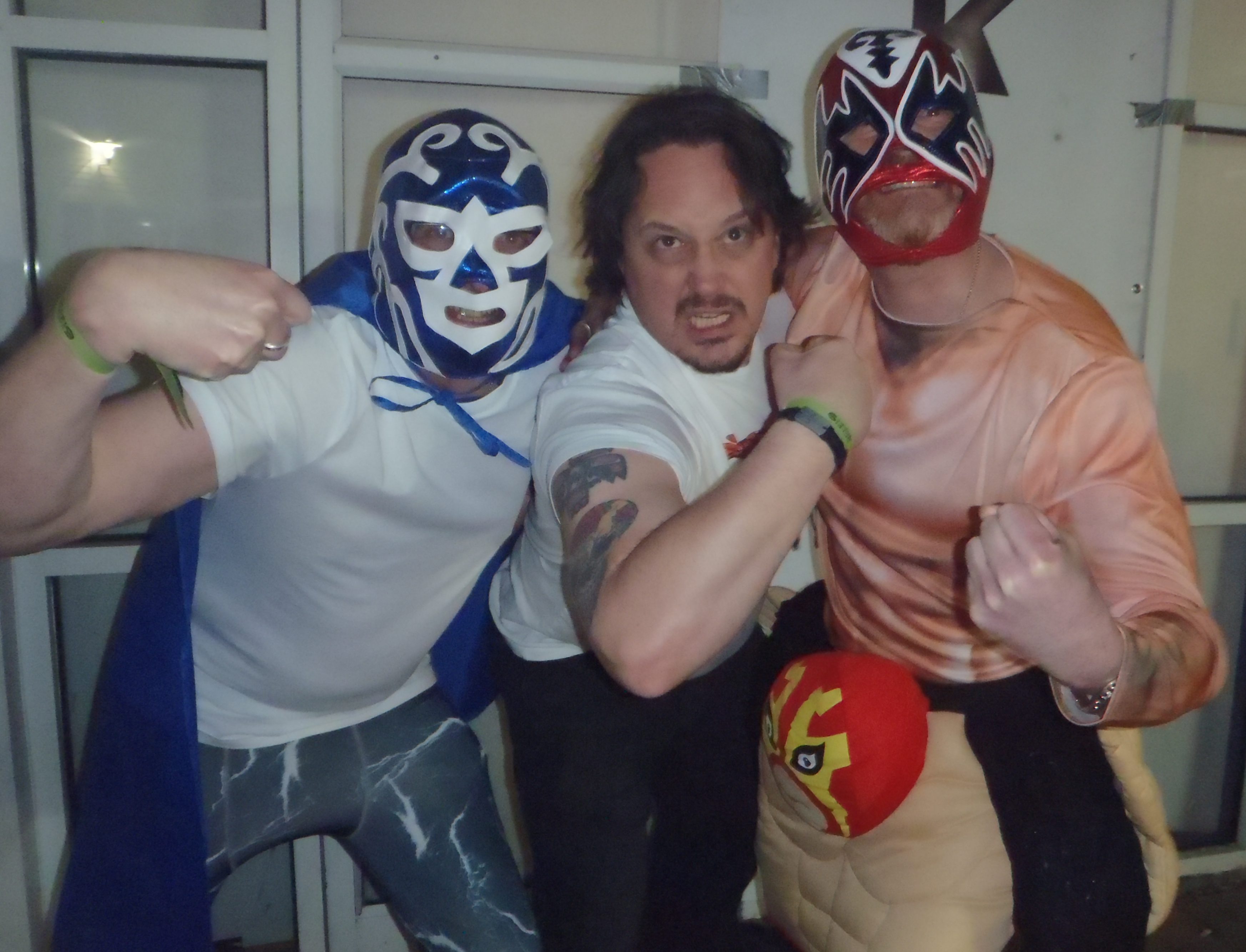 OLYMPUS DIGITAL CAMERA Published April 19, 2018 at 3491 × 2668 in Sci Fi Weekender 2018 – Part 3 Your author with Luchadors