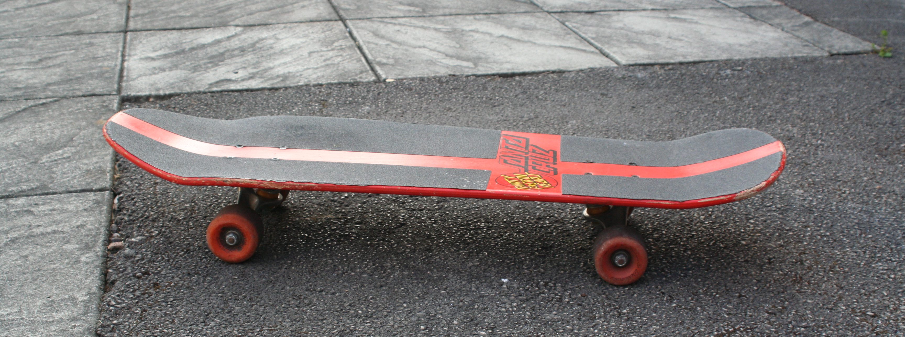 No matter – cool graphic or not, this deck was to be skated.  I transferred my Indy trucks and OJII wheels and was ready to go.  Well, when I’d also added the Powell Rib Bones as well.  Not to save the graphic, mind – in those days the received wisdom (at least amongst my friends and I) was that the rails helped you slide better.