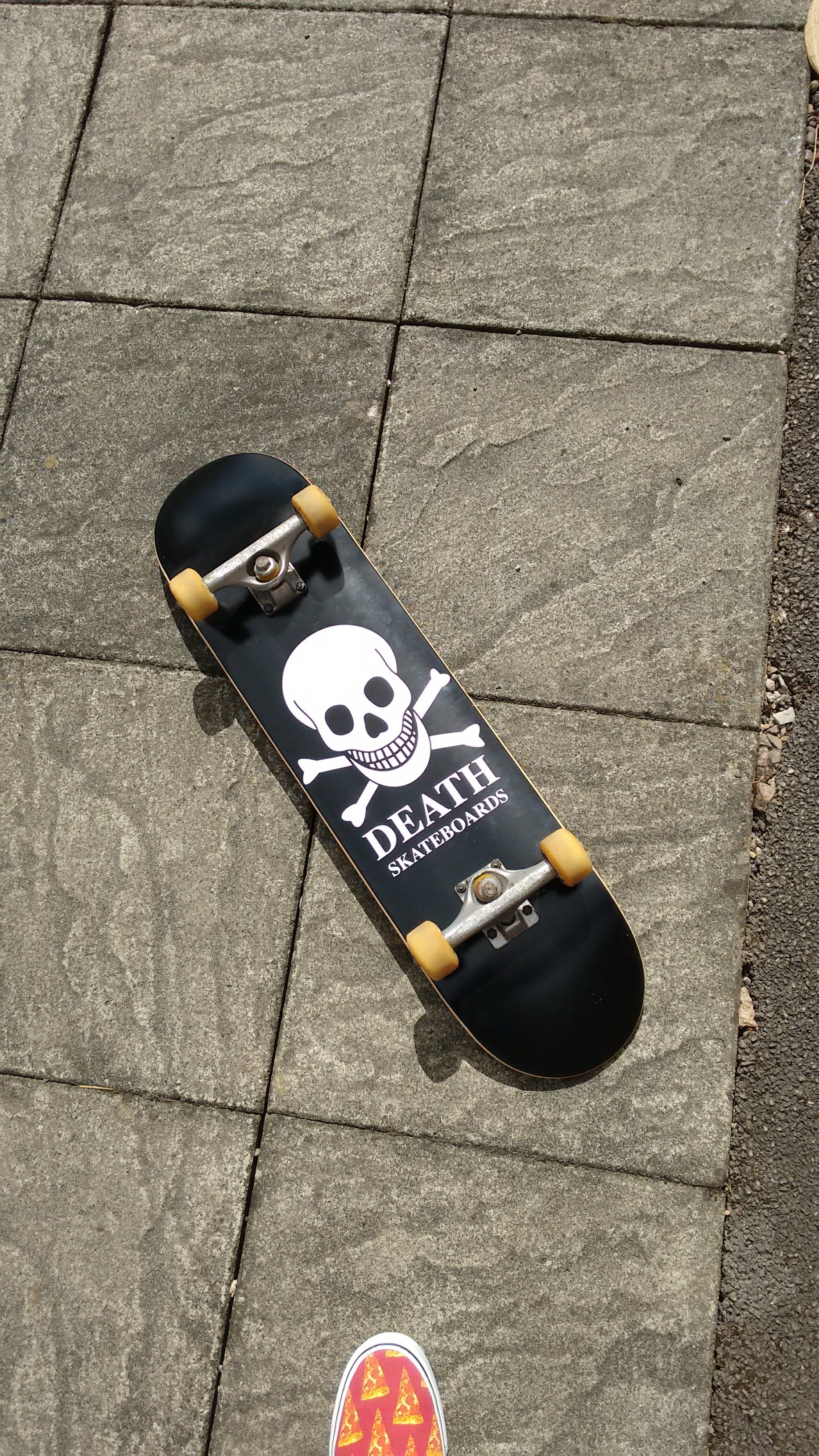 So I opted for something a little smaller, and chose a 7.75″ Death skateboards deck.  Fixed up with Independent trucks, Indy truck bolts and Death wheels, it’s a formidable monster of a skateboard and is preforming fine (unlike me).